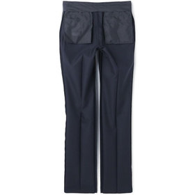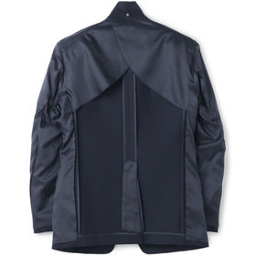 ジャケットは細めのシルエットでショート丈。体に沿った小さなアームホール&細身のスリーブと絞りの効いたウエストラインに直線的なフロントラインと緩やかなスラントポケットそして、ゴージラインが高めのナローラペル。パンツは股上浅めのタイトシルエット。