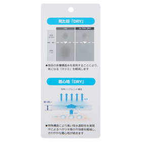 ※「見た目DRY」の理由:糸の工夫による「汗ジミ抑制」透け防止の素材に使用していた光を乱反射させる特殊原糸を応用した多層構造糸を使用。これにより優れた汗ジミ抑制機能を実現しました。