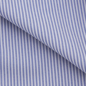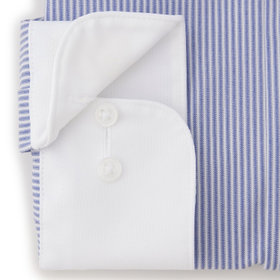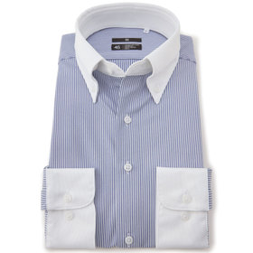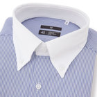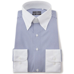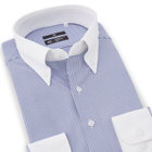 爽快なブルーと白のストライプ柄の生地に、白襟が映えるクレリック仕様。清潔感と知性を兼ね備え、第一印象をスマートに演出します。