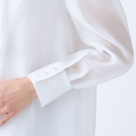 肩幅をキュッと狭め、肩先にタックを寄せたパフ袖デザインは細身な見た目でも肩回りゆったり◎
