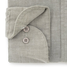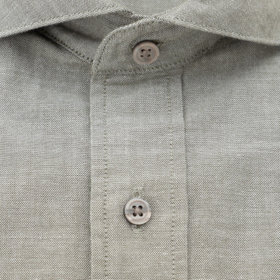 一部の商品では、高級シャツで使われる天然貝をくりぬいた釦を使用しています。天然貝釦とは白蝶貝、黒蝶貝、などの貝殻を原料とし、一個ずつ手作業で貝をくりぬいて作っています。天然貝は形状(凹凸感)・風合い・色・が一個ずつ異なり、同じものが存在しません。※形状(凹凸感)等により、釦の一部が「欠け」「割れ」ているように見えますが、天然貝釦の特徴になります。