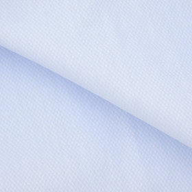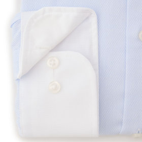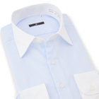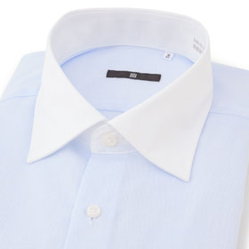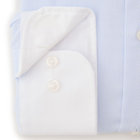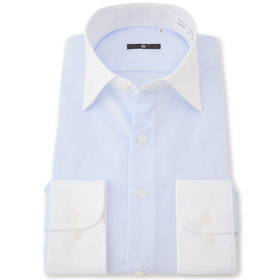 爽快なブルーの生地に、白襟が映えるクレリック仕様。清潔感と知性を兼ね備え、第一印象をスマートに演出します。