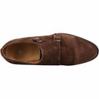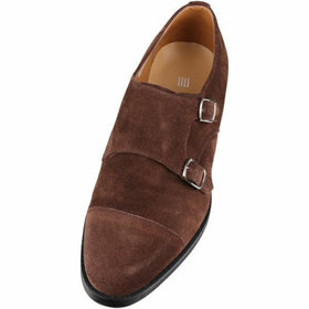 ブラック×スエードのダブルモンクストラップのドレスシューズです。モンクとはヨーロッパにおける「修道僧」たちが愛用していた尾錠留めの靴を原型としてつくられたものです。スエード素材は革の裏面(肉面)を細やかな研磨剤で毛羽立たせ整えたものです。お手入れについては履いた後にスエードブラシでブラッシングし、ほこりを落とす程度でO.K。履きおろすときに汚れが付きにくくするためにウォータープルーフスプレーを全体にまんべんなくかけるとなお良しです。もし、汚れが付着したときはバックスガムでその部分をこすって落とすように。(ただし強くこすると毛が抜け落ちてしまうので注意。)また靴底は合成ゴムで、すべりにくく履きやすく仕上げました。
