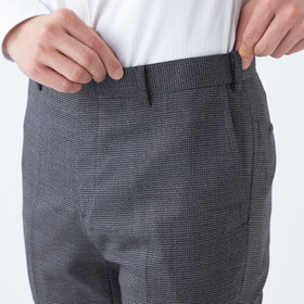 ウエスト部分が伸びるウエストムーブ仕様。膝から裾口にかけて細くなるテーパードパンツ。フロントポケットを少し斜めにする事で手の入りを良くしています。