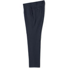 (5)膝から裾口にかけて細くなるテーパードパンツ。