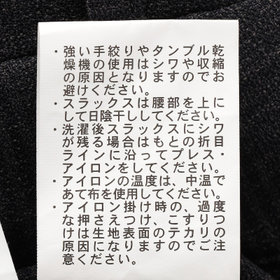 スーツやパンツのサイズ確認は、直立姿勢だけではなく、椅子に座った時の負荷。しゃがんだ時の負荷を考えたサイズ選びを必ずお願いします。ヒップ・太もも部分の生地にゆとりがない場合等の無理なサイズ選びは、体型や動きに関係なく生地や糸に負荷がかかり、「縫い目のほつれ」「生地の破れ」が起こります。また、両太もも同士が当たる場合や生地にゆとりがない場合、股ズレで生地が破れる可能性がございます。実店舗での商品確認・試着にて正しいサイズの購入をお勧めいたします。サイズが合わない事による「縫い目のほつれ」「生地の破れ」は「返品」「交換」「無償修理」はいたしかねます。また商品状態により修理が出来ない場合もございます。