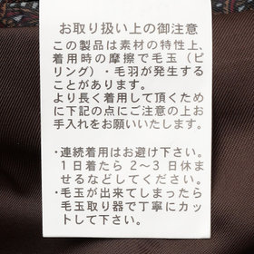 (5)汚れた場合はすぐにクリーニング屋または専門業者に相談しましょう。※衣類の気付かないシミが虫食い等の原因になる場合もありますのでシーズンオフには出来るだけ早くクリーニングに出しましょう。しかしクリーニングの出しすぎは生地を傷める場合がありますので注意しましょう。