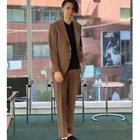 スーツのシルエットは、ジャケットのバスト、ウエストを広げて、ボックスシルエットのようなリラックス感のある見え方です。