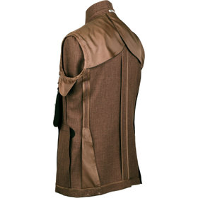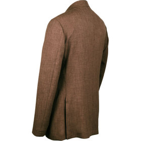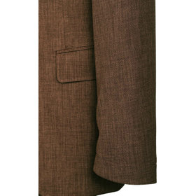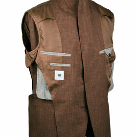 スーツの素材は、ポリエステル100%のリネンライク・シャンブレーを使い、