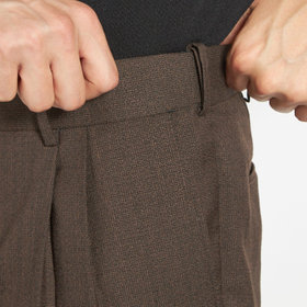 スーツやパンツのサイズ確認は、直立姿勢だけではなく、椅子に座った時の負荷。しゃがんだ時の負荷を考えたサイズ選びを必ずお願いします。ヒップ・太もも部分の生地にゆとりがない場合等の無理なサイズ選びは、体型や動きに関係なく生地や糸に負荷がかかり、「縫い目のほつれ」「生地の破れ」が起こります。また、両太もも同士が当たる場合や生地にゆとりがない場合、股ズレで生地が破れる可能性がございます。実店舗での商品確認・試着にて正しいサイズの購入をお勧めいたします。サイズが合わない事による「縫い目のほつれ」「生地の破れ」は「返品」「交換」「無償修理」はいたしかねます。また商品状態により修理が出来ない場合もございます。