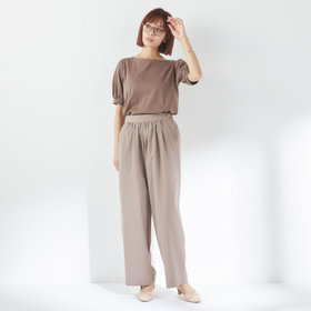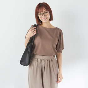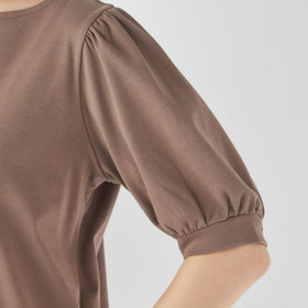 肩を華奢に見せる大きめのパフスリーブと長めにした袖丈が腕をほっそり見せます。