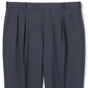 ジャケットはパッチポケットの約8cmラペル。パンツは2インタックのテーパードでウエストムーブ仕様。