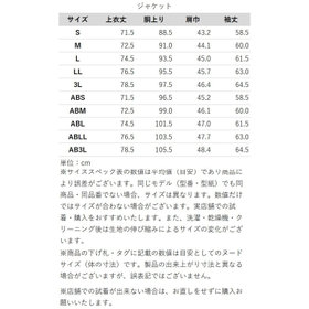ジャケットは3WAY、衿が脱着可能でワイドラペル&ピークドラペルとノーカラーで着用可能。パンツは2パンツで「1タックテーパード&ウエストインドローコード、ウエストシャーリング、右ポケットに隠しコンシールファスナー、裾上げ仕様」と「2タックテーパード&2WAYドローコード、ベルトループレス、ウエストシャーリング、隠しコンシールファスナー、裾上げ済み仕様(短め)」S~LLはY体とA体の中間サイズ、ABS~ABLLはAB体とBB体の中間サイズ。