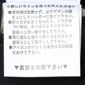 (1)型崩れを防ぐ為に、着用後はポケットの中身を全部出し、クリース(折り目)を合わせてハンガーに掛けましょう。(2)軽くブラッシングを行い、シワのある部分には軽く霧吹きで水分を与えると次回着用時のお手入れが簡単になります。※使用後のお風呂場にハンガーに掛けて置くこともシワ回復には効果的です。(3)連続着用はパンツの型崩れや寿命を短くします。綺麗でお洒落に長い年数着用する為にも、次の着用まで、中2~3日は空けましょう。※連続着用は毛玉・股ズレ・ニオイ等の原因にもなります。(4)汚れた場合はすぐにクリーニング屋または専門業者に相談しましょう。※衣類の気付かないシミが虫食い等の原因になる場合もありますのでシーズンオフには出来るだけ早くクリーニングに出しましょう。しかしクリーニングの出しすぎは生地を傷める場合がありますので注意しましょう。(5)着用前に気になるシワやパンツのクリース(折り目)部分にスチームでアイロンを掛けましょう。※必ずあて布をしてアイロンを掛けましょう。また、シワなどはハンドスチーマーがあるとお手入れが簡単です。