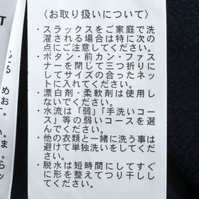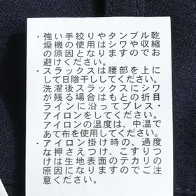 (1)型崩れを防ぐ為に、着用後はポケットの中身を全部出し、クリース(折り目)を合わせてハンガーに掛けましょう。(2)軽くブラッシングを行い、シワのある部分には軽く霧吹きで水分を与えると次回着用時のお手入れが簡単になります。※使用後のお風呂場にハンガーに掛けて置くこともシワ回復には効果的です。(3)連続着用はパンツの型崩れや寿命を短くします。綺麗でお洒落に長い年数着用する為にも、次の着用まで、中2~3日は空けましょう。※連続着用は毛玉・股ズレ・ニオイ等の原因にもなります。(4)汚れた場合はすぐにクリーニング屋または専門業者に相談しましょう。※衣類の気付かないシミが虫食い等の原因になる場合もありますのでシーズンオフには出来るだけ早くクリーニングに出しましょう。しかしクリーニングの出しすぎは生地を傷める場合がありますので注意しましょう。(5)着用前に気になるシワやパンツのクリース(折り目)部分にスチームでアイロンを掛けましょう。※必ずあて布をしてアイロンを掛けましょう。また、シワなどはハンドスチーマーがあるとお手入れが簡単です。
