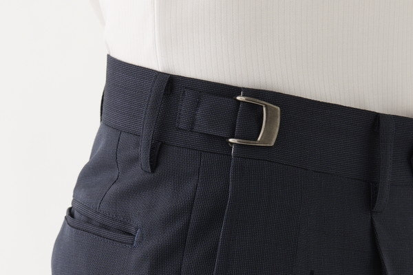 デザイン性の高いクラシックアジャスター。ウエストサイズの変化にも対応できるがデザインとして見せるようにオーダーする方も多い。ベルトでも良いが、見せるのであればサスペンダーで演出。
