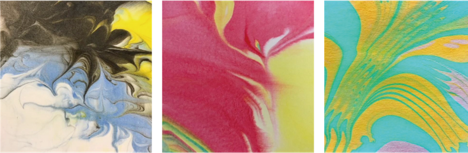 ショコラボで働く障がい者メンバーが、想い想いの色をセレクトして制作したマーブリングアートです。チョコレート商品のパッケージデザインとしても使用しています。