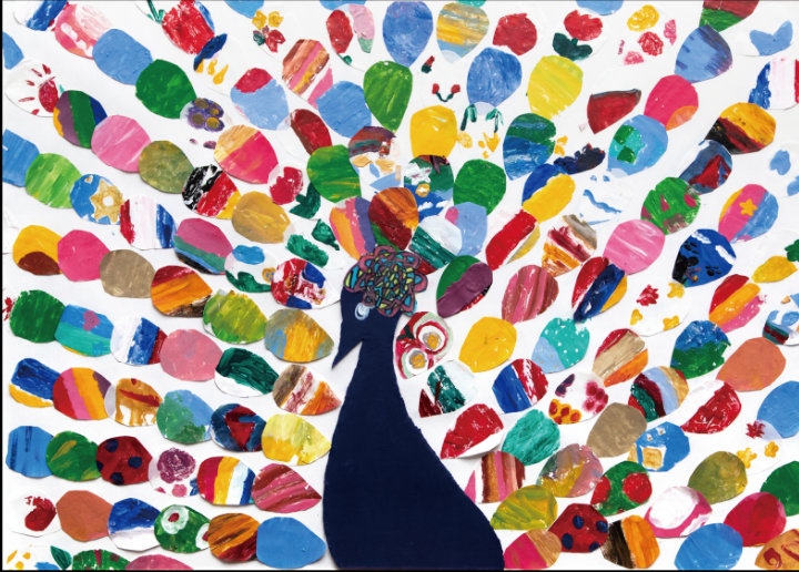 廃材となる品質表示ラベルの台紙や段ボールを使い、約40名の障がい者メンバーが「幸せ」に感じる色を、クジャクの羽に想い想いに描いたエシカル(Ethical)な作品です。