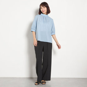 首元を美しく演出するハイネックデザインが、上品で洗練された印象を与えるブラウス。