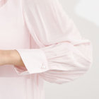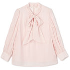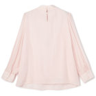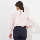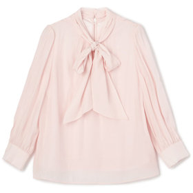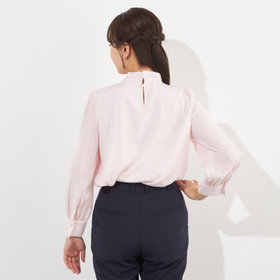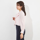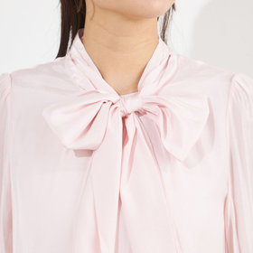 上品なツヤのある素材に華やかなリボンが印象のブラウス。