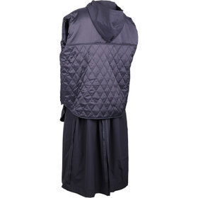 本体+ライナーの構造で4WAYの着用が可能です。裾に向かってややAラインに広がる縦長シルエット。ボレロのようなドレープ感ある背ヨークとウエスト後ろのシャーリングが背中を華奢に、腰高に見せてくれるデザイン。ライナーは単体でキルトジャケットとしても着用可能。またライナーの背中部分にはヒーター(カーボンナノチューブ)付き。※バッテリーは.付属しません。