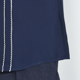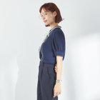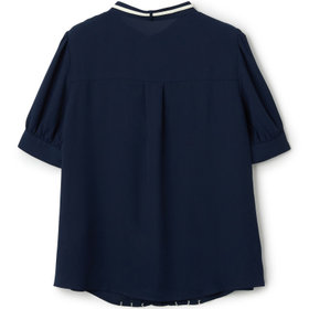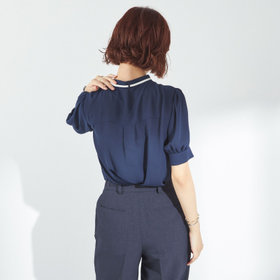 バンドカラー×細リボンタイ×バイカラーステッチが特徴の、存在感たっぷりな半袖ブラウスです。