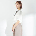 バンドカラー×細リボンタイ×バイカラーステッチが特徴の、存在感たっぷりな半袖ブラウスです。