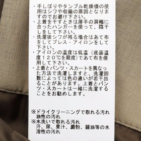 ※サイズスペック表の数値は平均値(目安)であり商品により誤差がございます。同じモデル(型番・型紙)でも同商品・同品番でない場合、サイズは異なります。数値だけではサイズが合わない場合がございます。実店舗での試着・購入をおすすめいたします。また、洗濯・乾燥機・クリーニング後は生地の伸び縮みによるサイズの変化がございます。