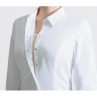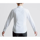 【POINT.1 】縦の切り替えによって、胸の張りと細みを出し、overEの美しいシルエットを形成します。胸が大きいと反り腰になる方が多い為、アームホールの位置を後ろ気味に設定することで、窮屈感が軽減し、快適に着用していただけます。同じボディサイズで着丈、裄丈が選べるので、ジャストサイズで着用できます。【POINT.2】隠し釦・・・前身頃が開かないように、隠し釦を3つ付けました。隠し釦にはスナップ釦を採用しているため、脱着が簡単な仕様になっています。【POINT.3】背ダーツ/ヨーク・・・ヨークを左右2枚に切り分け、身体(肩)のラインに沿って裁断している為、肩や背中の動きにフィットした着心地が体感できます。背ダーツでさらにウエストを絞ったシルエットに。裾回りもフレアになっている為、腰部分で生地が溜まることなくキレイに着用できます。【POINT.4】衿型・・・ジャケットを羽織った際にもおさまりの良い衿になっています。柔らかい芯地を使用しているので窮屈感を感じさせません。レギュラーとスキッパーの2種類の衿型で展開します。【POINT.5】カフス回りのサイズ調整ができるように釦を2つ付けました。腕時計、アクセサリーをした場合でもカフス回りの調整が可能です。【POINT.6】透けにくい素材なのでジャケットを脱いでも気にならない、安心のシャツ。インナーが透けにくい素材で一枚でも安心です。