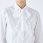 スキッパー衿をベースにギャザーを多めにとったフリルと、シフォン素材のリボンタイ付きの3WAYブラウスです。