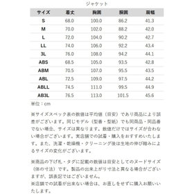 ※サイズスペック表の数値は平均値(目安)であり商品により誤差がございます。同じモデル(型番・型紙)でも同商品・同品番でない場合、サイズは異なります。数値だけではサイズが合わない場合がございます。実店舗での試着・購入をおすすめいたします。また、洗濯・乾燥機・クリーニング後は生地の伸び縮みによるサイズの変化がございます。